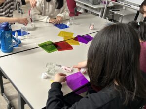 今日の造形教室は瓶にセロファンを張り付けてキャンドルをつくりました。好きな色のセロファンで模様をつくって瓶に貼っていきます。思い思いのキャンドルができました。教室を暗くしてみんなで鑑賞会をしました。
